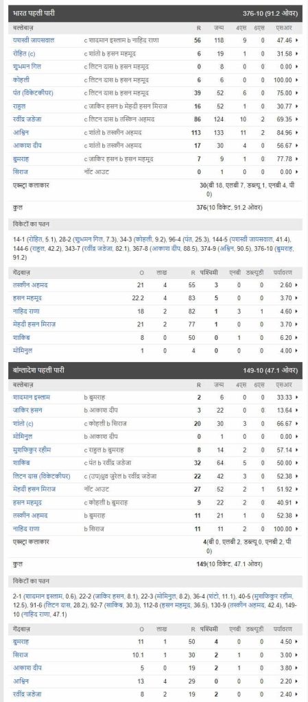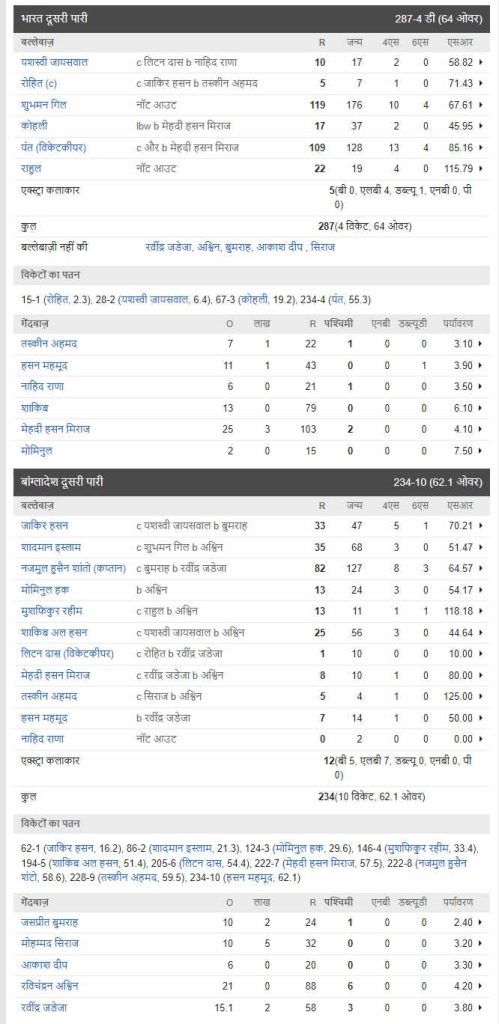 इसके बाद बांग्लादेश को 1.5 सत्र में 149 रन पर आउट कर दिया गया, जिसमें शाकिब और लिटन के बीच अर्धशतकीय साझेदारी उनकी बल्लेबाजी का एकमात्र आकर्षण रही. भारत ने फॉलो-ऑन लागू नहीं किया, पंत और गिल के शतकों के परिणामस्वरूप भारत ने बांग्लादेश को 500 से अधिक का विशाल लक्ष्य दिया. मेहमान टीम ने अच्छी शुरुआत की और उसके सलामी बल्लेबाजों ने अर्धशतकीय साझेदारी की. कल का खेल खत्म होने तक बांग्लादेश की टीम चार विकेट खोकर 158 रन बनाए थे.