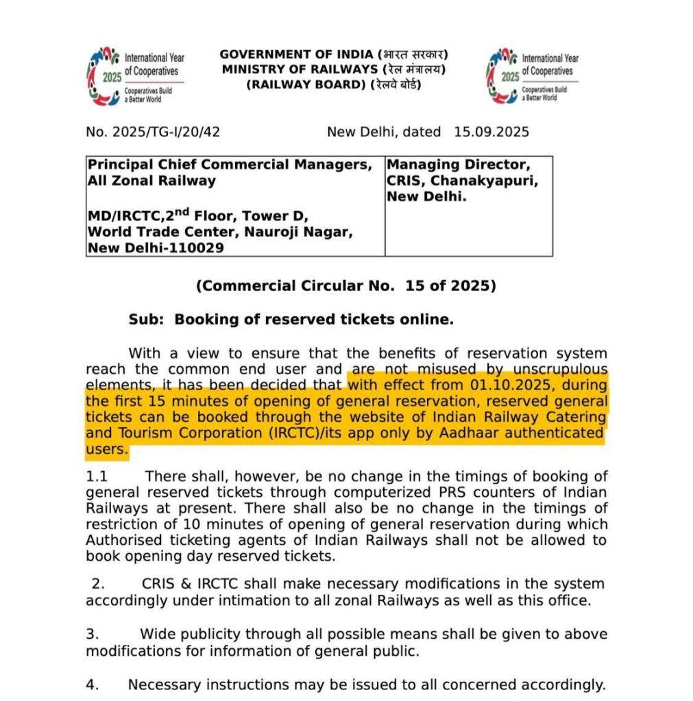 रेलवे बोर्ड ने सोमवार को इस मामले में एक आदेश जारी किया। उसने बताया कि यह सुनिश्चित करने के लिए कि आरक्षण प्रणाली का लाभ आम उपयोगकर्ता तक पहुंचे और टिकट दलालों की ओर से इसका दुरुपयोग न हो, इसके लिए एक निर्णय लिया गया है। 1 अक्टूबर 2025 से सामान्य आरक्षण खुलने के पहले 15 मिनट के दौरान केवल आधार-प्रमाणित उपयोगकर्ता ही भारतीय रेलवे खानपान एवं पर्यटन निगम (IRCTC) की वेबसाइट/इसके ऐप के माध्यम से आरक्षित जनरल टिकट बुक कर सकेंगे। जबकि भारतीय रेलवे के कम्प्यूटरीकृत पीआरएस काउंटरों के माध्यम से सामान्य आरक्षित टिकटों की बुकिंग के समय में कोई बदलाव नहीं होगा। यह नया नियम तब आया है, जब रेलवे ने जुलाई 1 से तत्काल टिकट के लिए आधार कार्ड को जरूरी कर दिया है। 1 जुलाई 2025 से तत्काल टिकट बुक करने के लिए आधार कार्ड देना जरूरी हो गया है। यह नियम IRCTC की वेबसाइट और ऐप पर ही लागू होगा।