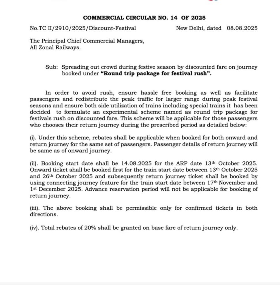 रेलवे ने त्योहारों के सीजन में भीड़ को मैनेज करने और यात्रियों को बेहतर सुविधा देने के लिए ‘राउंड ट्रिप पैकेज’ स्कीम की घोषणा की है। इस स्कीम के तहत जो यात्री अपनी रिटर्न जर्नी तय समय सीमा के भीतर बुक करेंगे, उन्हें रिटर्न टिकट के बेस किराए पर 20% की छूट मिलेगी।