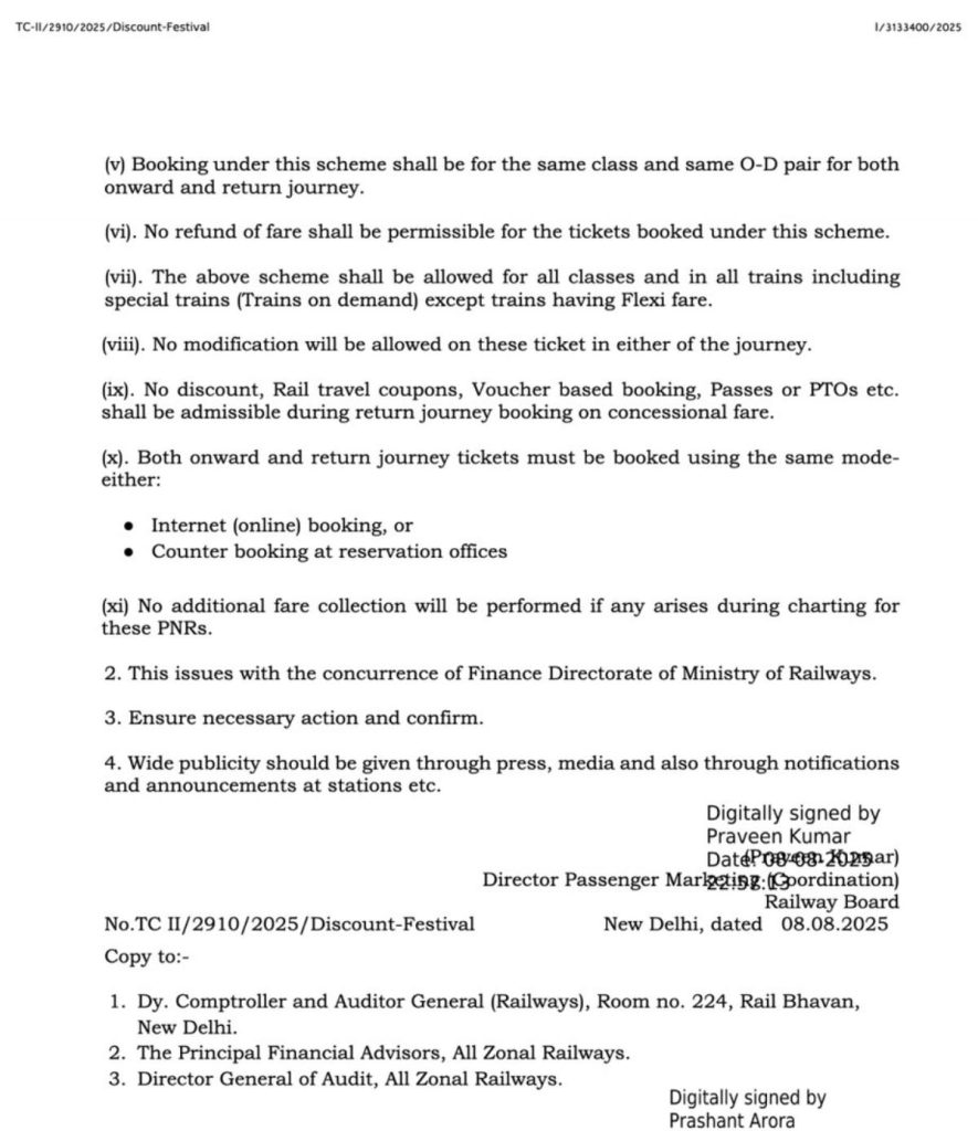 इस स्कीम में छूट तभी मिलेगी जब दोनों तरफ का टिकट एक ही यात्रियों के नाम से और कन्फर्म हो। रिटर्न टिकट की बुकिंग के लिए एडवांस रिजर्वेशन पीरियड लागू नहीं होगा। छूट केवल रिटर्न जर्नी के बेस किराए पर दी जाएगी। रेलवे ने बताया कि यह योजना फिलहाल एक्सपेरिमेंटल बेसिस पर लागू की गई है, ताकि त्योहारों के समय ट्रेनों का दोनों तरफ से बेहतर इस्तेमाल हो सके।