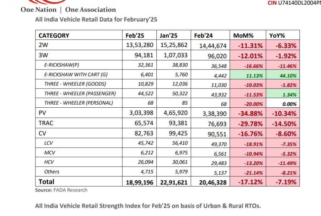 India’s Vehicle Sales Crash : भारतीय ऑटोमोबाइल बाजार में फरवरी महीने में वाहनों की खुदरा बिक्री को लेकर रिपोर्ट सामने आई है. फाडा (Federation of Automobile Dealers Associations of India) की रिपोर्ट में सामने आया कि वाहनों की खुदरा बिक्री में करीब 7 प्रतिशत की गिरावट आई है. फरवरी 2025 में भारतीय ऑटोमोबाइल बाजार में 7.19% की सालाना गिरावट और 17.12% की मासिक गिरावट दर्ज की गई.