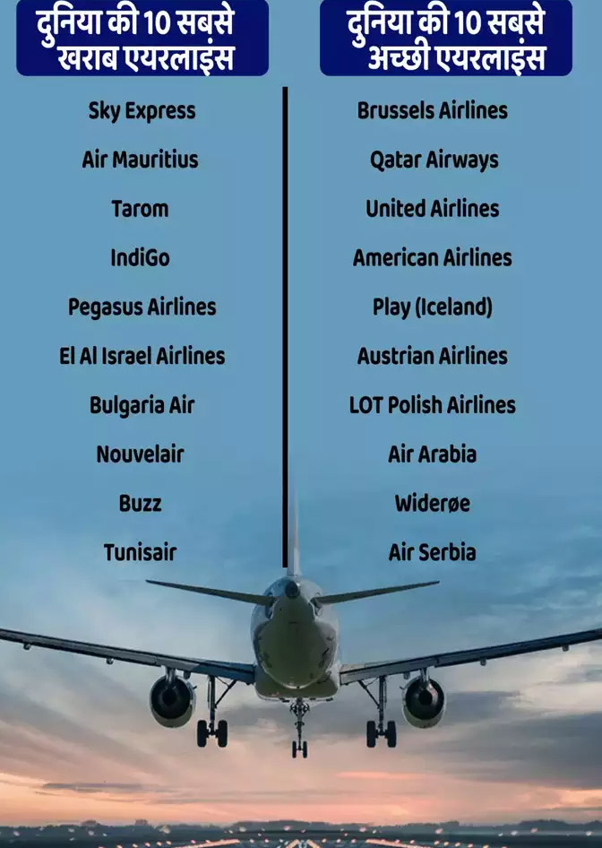 सर्वे के अनुसार, ब्रुसेल्स एयरलाइन सबसे अच्छी है क्योंकि यह बेल्जियम की एयरलाइन है, जो ड्यूश लुफ्थांसा एजी का हिस्सा है. दुनिया में सर्वश्रेष्ठ सेवा देने वाली कतर एयरवेज दूसरे स्थान पर है. भारत की कोई भी एयरलाइन दुनिया की शीर्ष 10 अच्छी एयरलाइनों में नहीं है.