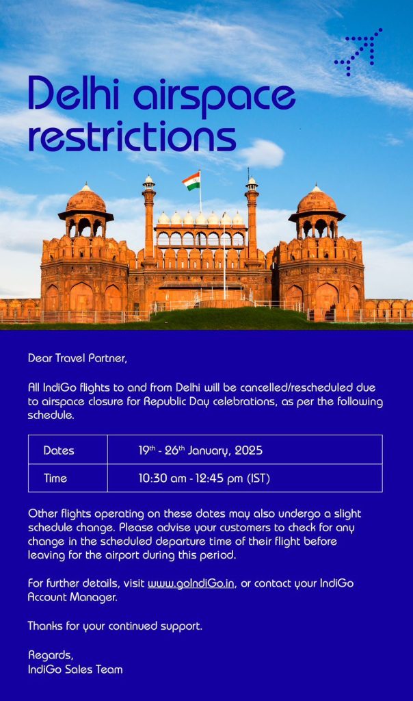 IndiGo एयरलाइंस की ओर से जारी सूचना में बताया गया है कि गणतंत्र दिवस समारोह के मद्देनजर 19 से 26 जनवरी तक दिल्ली की हवाई सीमा में सुबह 10.30 बजे से लेकर दोपहर 12.45 बजे बंद रहेगी. इस वजह से इस समय में दिल्ली आने-जाने वाले विमानों का परिचालन प्रभावित रहेगा.