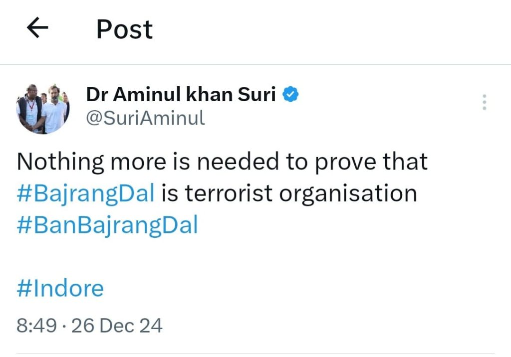 इंदौर के कांग्रेस के पूर्व प्रवक्ता अमीनुल सूरी ने अपने सोशल मीडिया अकाउंट पर पोस्ट शेयर कर बजरंग दल को आतंकी संगठन बतायाहै। उन्होंने बजरंग दल पर हालिया घटनाओं को लेकर गंभीर आरोप लगाए। सूरी ने कहा कि “कौन क्या पहनेगा और कौन किसके साथ घूमेगा” यह सब बजरंग दल तय करेगा। उन्होंने आरोप लगाया कि हाल ही में बजरंग दल ने एक डिलीवरी बॉय के कपड़े उतरवाए और नगर निगम की टीम पर हमला किया, जिसके खिलाफ 12 घंटे बाद ही एफआईआर दर्ज हुई। इसीलिए इस संगठन को सरकार को बैन करना चाहिए।