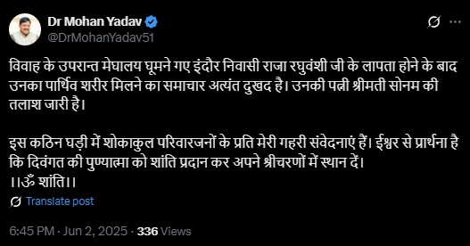 सीएम डॉ. मोहन यादव ने एक्स पर पोस्ट कर लिखा, “विवाह के उपरान्त मेघालय घूमने गए इंदौर निवासी राजा रघुवंशी जी के लापता होने के बाद उनका पार्थिव शरीर मिलने का समाचार अत्यंत दुखद है। उनकी पत्नी श्रीमती सोनम की तलाश जारी है। इस कठिन घड़ी में शोकाकुल परिवारजनों के प्रति मेरी गहरी संवेदनाएं हैं। ईश्वर से प्रार्थना है कि दिवंगत की पुण्यात्मा को शांति प्रदान कर अपने श्रीचरणों में स्थान दें। ।।ॐ शांति।।”