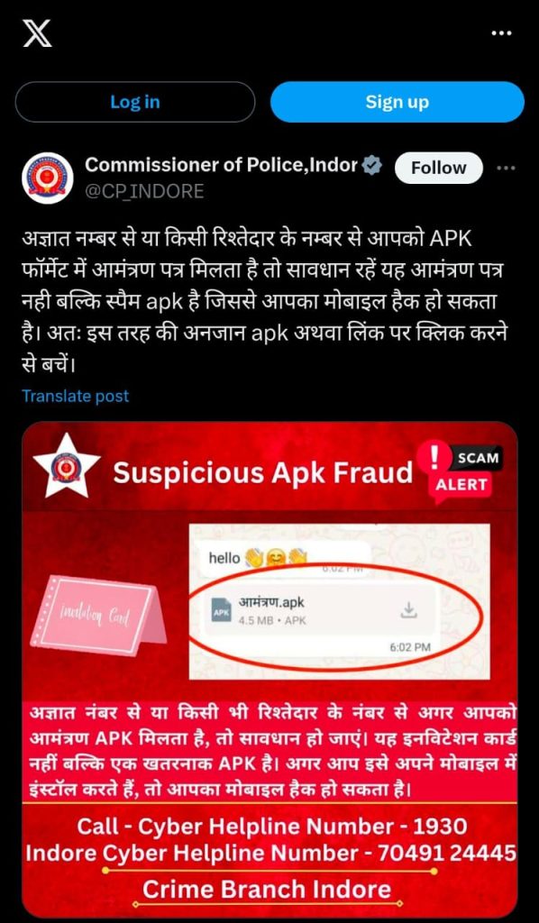 चंकी बाजपेयी, इंदौर। अगर आपके पास भी शादी या अन्य कोई कार्यक्रम का कार्ड आता है, तो सावधान हो जाएं… जी हां… मध्य प्रदेश की आर्थिक राजधानी इंदौर में 12 नवंबर से अब तक 6 शिकायतें आ चुकी है। जिसमें चार शिकायतकर्ताओं के साथ लाखों की धोखधड़ी हुई है। अननोन नंबर से कार्ड आने के बाद मोबाइल फोन हैक हो जाता है। इसे लेकर क्राइम ब्रांच ने सतर्क और सुरक्षित रहने की अपील की है। सत्यता की जांच करने के बाद ही डाउनलोड करने की बात कही है।