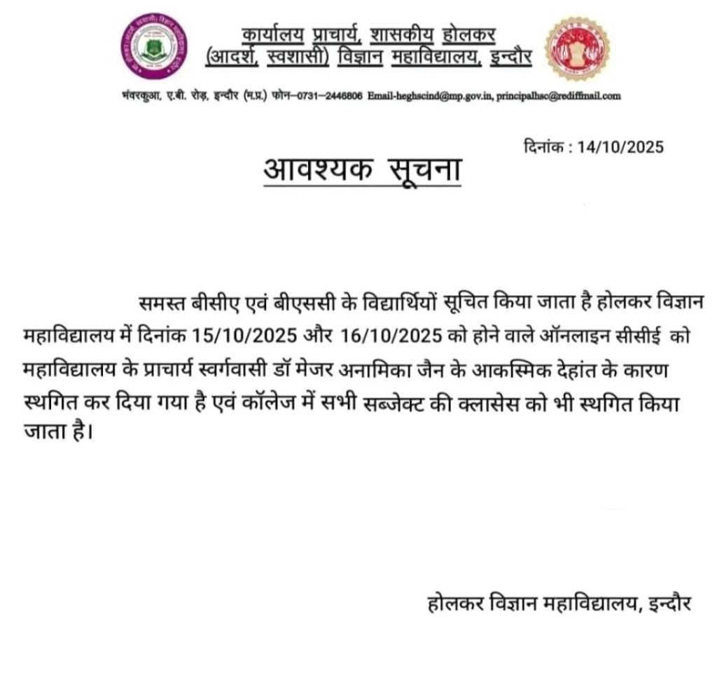 हेमंत शर्मा, इंदौर। इंदौर के होलकर साइंस कॉलेज में अफवाहों का तूफान उठा और पूरे कैंपस में हड़कंप मच गया। कॉलेज की प्राचार्य डॉ. अनामिका जैन के “निधन” की झूठी खबर व्हाट्सअप पर वायरल हुई। कुछ ही मिनटों में छात्रों और प्रोफेसरों ने शोक संदेशों की बाढ़ लगा दी। वहीं अगले दिन होने वाली CCA परीक्षा को लेकर भी पूरा माहौल भ्रमित हो गया। लेकिन कुछ ही घंटे बाद, खुद डॉ. जैन ने सोशल मीडिया पर स्पष्ट किया और कहा- “मैं पूरी तरह स्वस्थ हूँ, यह खबर झूठी और भ्रामक है।”