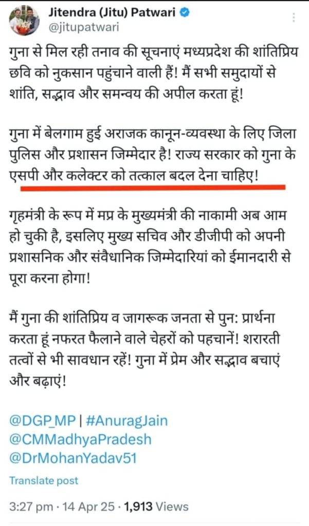 दरअसल, गुना शहर में एक मस्जिद के सामने (12 अप्रैल) हनुमान जन्मोत्सव की शोभायात्रा पर पथराव किया गया था। इसे लेकर जमकर सियासत हुई थी। 14 अप्रैल को जीतू पटवारी ने सोशल मीडिया पर एक ट्वीट किया था। जिसमें उन्होंने लिखा था कि ‘गुना में जो अराजकता फैली है, उसके लिए जिला प्रशासन और पुलिस जिम्मेदार है। राज्य सरकार को तत्काल प्रभाव से एसपी और कलेक्टर को हटा देना चाहिए।’ लेकिन अब, 20 अप्रैल को इंदौर में हुई एक प्रेस कॉन्फ्रेंस के दौरान जीतू पटवारी ने एक बिल्कुल अलग बात कही।