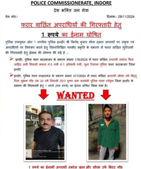 चंकी बाजपेयी, इंदौर। आमतौर पर देखा गया है कि अपराधियों को पकड़ने के लिए हजारों या लाखों रुपये का इनाम घोषित किया जाता है। लेकिन मध्य प्रदेश के इंदौर से एक अनोखा मामला सामने आया है। जहां पुलिस ने गंभीर अपराध में फरार चल रहे बदमाश को पकड़ने के लिए महज 1 रुपये का इनाम घोषित किया है। आइए जानते है आखिर इसकी वजह क्या है…