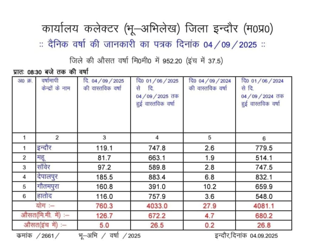 इंदौर में गुरुवार सुबह 8.30 बजे तक हुए पिछले 24 घंटे में पांच इंच से ज्यादा बारिश हुई। जिले में सबसे अधिक सवा 7 इंच पानी देपालपुर क्षेत्र में गिरा। लगातार बारिश से कुल वर्षा का आंकड़ा बीते साल के करीब पहुंच गया है। इधर, इंदौर का सबसे बड़ा जलाशय कहे जाने वाले यशवंत सागर में भी पानी का जलस्तर 19 फीट पहुंच गया। जिसकी वजह से डैम के छह गेट खोले गए है।