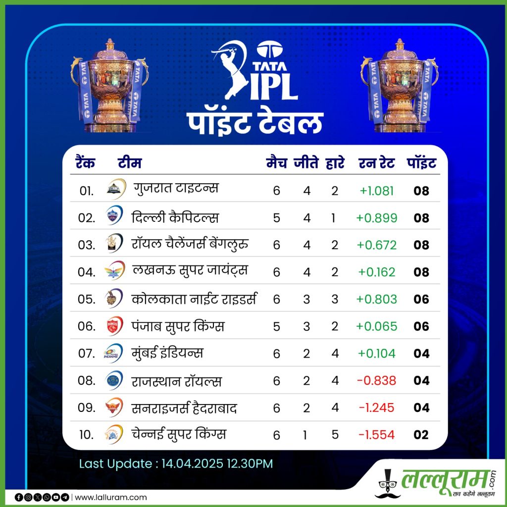 IPL 2025 Points Table: हार्दिक पांड्या की कप्तानी में मुंबई इंडियंस ने बीते रविवार दिल्ली कैपिटल्स को उसी के घर में 12 रन से हराकर आईपीएल 2025 के पॉइंट्स टेबल पर हलचल मचा दी है। इस जीत के साथ मुंबई को दो अहम अंक मिले और अब उसके छह मैचों में दो जीत और चार हार के साथ कुल 4 अंक हो गए हैं। मुंबई का नेट रन रेट +0.104 है और वह अंक तालिका में सातवें स्थान पर पहुंच गई है। दूसरी तरफ, दिल्ली कैपिटल्स को इस सीजन में पहली हार मिली है, लेकिन पांच मैचों में चार जीत के साथ उसके पास अभी भी 8 अंक हैं और वह दूसरे स्थान पर बनी हुई है। गुजरात टाइटंस छह मैचों में चार जीत के साथ टॉप पर है।
