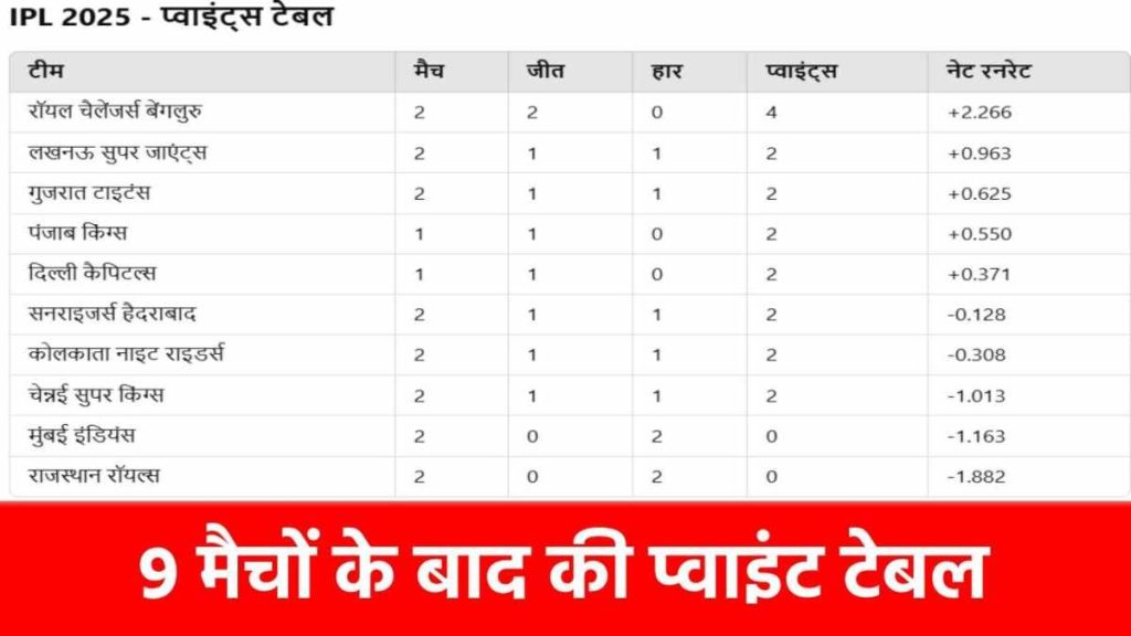 IPL 2025 पॉइंट्स टेबल (9 मैचों के बाद)