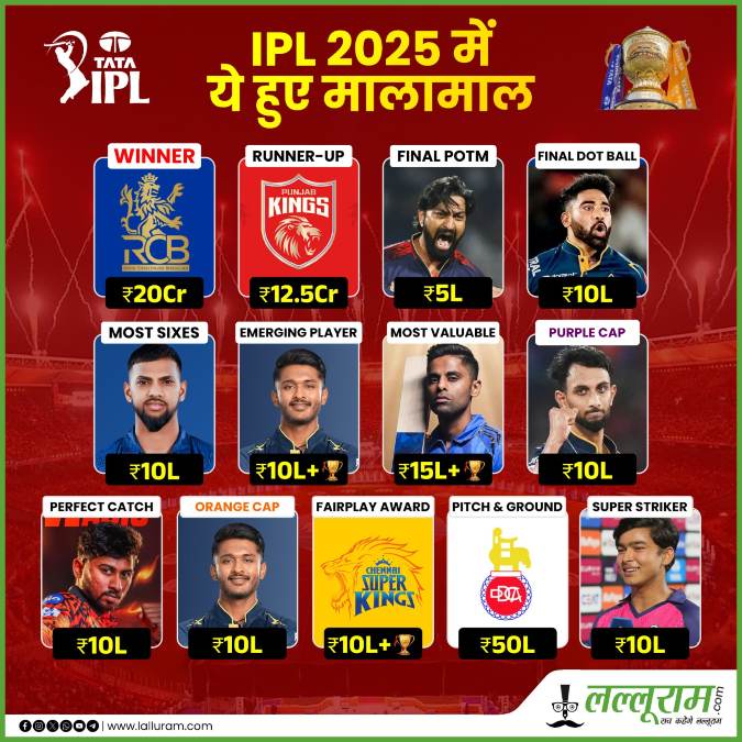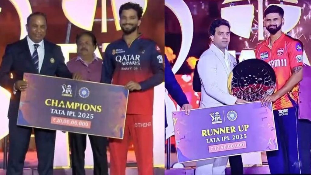 बता दें कि आईपीएल सीजन 18 में तीसरे स्थान पर रही मुंबई इंडियंस को 7 करोड़ और चौथे नंबर की टीम गुजरात टाइटंस को 6.50 करोड़ रुपये मिले। सीजन में सबसे ज़्यादा 759 रन बनाने वाले गुजरात के साई सुदर्शन को ऑरेंज कैप दी गई, जबकि सबसे ज़्यादा 25 विकेट लेने वाले प्रसिद्ध कृष्णा को पर्पल कैप मिली।