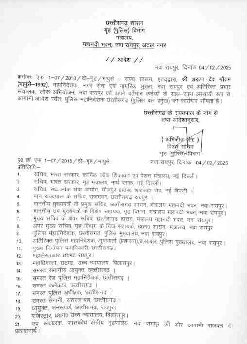 रायपुर। 1992 बैच के आईपीएस अरुण देव गौतम को छत्तीसगढ़ पुलिस में डीजीपी का प्रभार सौंपा गया है. डीजीपी के पद पर पूर्ण नियुक्ति तक अरुण देव गौतम प्रदेश के पुलिस प्रमुख के तौर पर कामकाज देखेंगे. डीजीपी अशोक जुनेजा सेवानिवृत्त हो गए हैं. यह भी पढ़ें : प्रचार बंद कर दो नहीं तो गोली मार दूंगा…,विधायक पर धमकी देने का आरोप, निर्दलीय प्रत्याशी के कार्यकर्ताओं ने थाने में की शिकायत