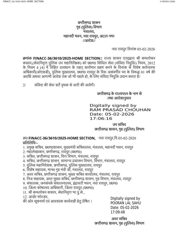 यह नियुक्ति छत्तीसगढ़ सिविल सेवा (संविदा नियुक्ति) नियम, 2012 के नियम 4(4) के अंतर्गत की गई है. संविदा सेवा की शर्तें पृथक से जारी की जाएंगी. जारी आदेश में स्पष्ट किया गया है कि कमलोचन कश्यप को कार्यभार ग्रहण करने की तिथि से एक वर्ष की अवधि अथवा आगामी आदेश तक (जो भी पहले हो) संविदा नियुक्ति दी गई है.