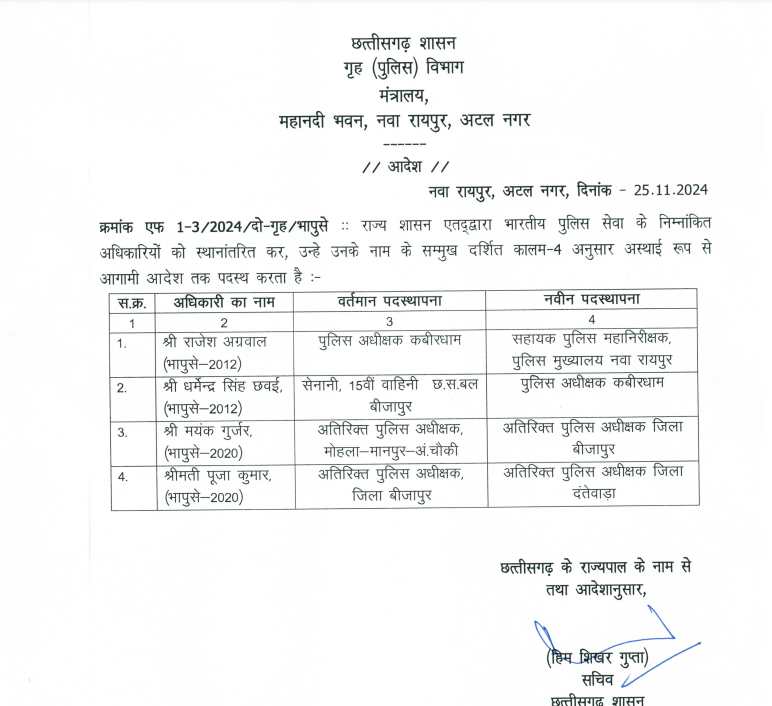 जारी आदेश के मुताबिक आईपीएस राजेश अग्रवाल (2012 बैच) को सहायक पुलिस महानिरीक्षक, पुलिस मुख्यालय नवा रायपुर, धर्मेन्द्र सिंह छवई (2012 बैच) को पुलिस अधीक्षक कबीरधाम, मयंक गुर्जर (2020 बैच) को अतिरिक्त पुलिस अधीक्षक, बीजापुर और पूजा कुमार (2020 बैच) को अतिरिक्त पुलिस अधीक्षक, दंतेवाड़ा जिले की जिम्मेदारी सौंपी गई है.
