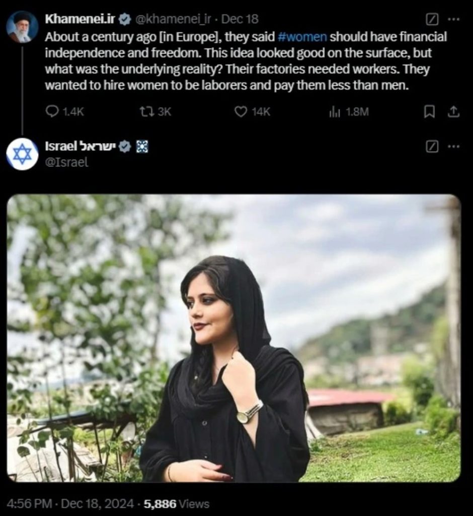 खामेनेई ने सोशल मीडिया पोस्ट में कहा था कि महिलाओं और पुरुषों की परिवार में अलग-अलग भूमिका होती है। उदाहरण के लिए पुरुष घर के खर्चों की जिम्मेदारी उठाते हैं जबकि महिलाओं की जिम्मेदारी होती है बच्चे पालना। इनमें कोई भी एक दूसरे से ओहदे में ऊंचा नहीं है बल्कि दोनों के गुण और योग्यताएं अलग-अलग है। खामेनेई के महिलाओं को लेकर इन्हीं ‘नेक’ विचारों के बाद इजरायल ने महसा अमीनी की तस्वीर पोस्ट कर जवाब दिया है।
