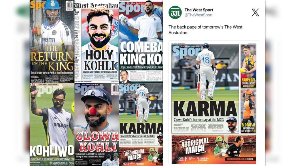 बात दें कि मैच के पहले दिन के विवाद के बाद वेस्टर्न ऑस्ट्रेलिया ने अपने स्पोर्ट्स पेज पर कोहली को जोकर की तस्वीर में दिखाया और अपने आर्टिकल की हेडलाइन को नाम दिया- ‘क्लाउन’। ये अखबार यहीं नहीं रुका। मैच के दूसरे दिन जब टीम इंडिया बल्लेबाजी कर रही थी और बेहतर स्थिति में नजर आ रही थी, तभी कोहली और यशस्वी जायसवाल के बीच रन को लेकर गलतफहमी हुई और युवा भारतीय बल्लेबाज रन आउट हो गए। इसके बाद कोहली को लेकर हूटिंग होने लगी और फिर 7 गेंद के अंदर खुद कोहली भी 36 रन बनाकर आउट हो गए। बस फिर क्या था, जब कोहली पवेलियन लौट रहे थे, तो ऑस्ट्रेलियाई फैंस उन्हें लेकर नारेबाजी करने लगे और मजाक उड़ाने लगे।