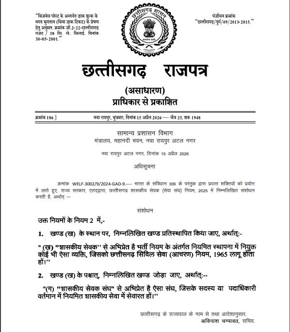 नियम 2 के खंड (ख) में बदलाव कर ‘शासकीय सेवक’ की परिभाषा को केवल नियमित स्थापना में नियुक्त और छत्तीसगढ़ सिविल सेवा (आचरण) नियम, 1965 लागू होने वाले व्यक्तियों तक सीमित कर दिया गया है। इसके बाद नया खंड (ग) जोड़ा गया है, जिसमें ‘शासकीय सेवक संघ’ को केवल उन संघों तक परिभाषित किया गया है जिनके सदस्य या पदाधिकारी वर्तमान में नियमित शासकीय सेवा में सेवारत हों।