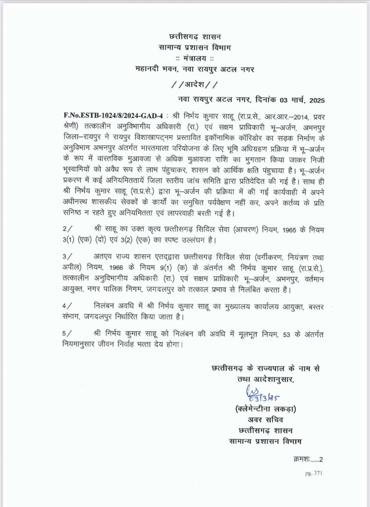 रायपुर। प्रस्तावित रायपुर-विशाखापटनम इकोनॉमिक कॉरिडोर के लिए भारतमाला परियोजना भूमि अधिग्रहण प्रक्रिया में गड़बड़ी पर तत्कालीन एसडीएम एवं वर्तमान में जगदलपुर नगर निगम आयुक्त निर्भय साहू (राप्रसे) को राज्य सरकार ने तत्काल प्रभाव से निलंबित कर दिया है. यह भी पढ़ें : भूपेश बघेल के छत्तीसगढ़ बजट को कवि सम्मेलन बताए जाने पर भाजपा को आपत्ति, कहा- गुरु घासीदास, वीर गुण्डाधुर का किया अपमान