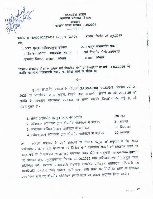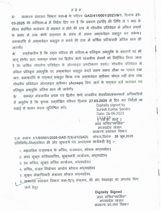 शब्बीर अहमद, भोपाल। मध्य प्रदेश के सरकारी कर्मचारियों के लिए जरूरी खबर है। सामान्य प्रशासन विभाग ने एक फरमान जारी किया है। जिसमें कहा गया है कि 30 जून तक सेल्फ असेसमेंट करना अनिवार्य होगा। यह काम न करने पर सैलरी नहीं मिलेगी। कर्मचारियों को सेल्फ असेसमेंट के लिए दो दिन का समय दिया गया है। इसके बाद अधिकारी, कर्मचारियों की परफॉर्मेंस रिपोर्ट तय करेंगे।