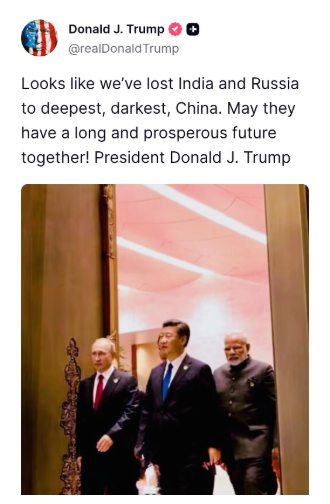 अमेरिका को लगता है कि भारत और रूस धीरे-धीरे चीन के करीब आ रहे हैं. रूस तो पहले से ही यूक्रेन युद्ध और पश्चिमी प्रतिबंधों की वजह से चीन पर निर्भर हो गया है. अब भारत का चीन और रूस दोनों के साथ एक ही मंच पर दिखाई देना, ट्रंप के लिए एक ‘Red Flag’ है.