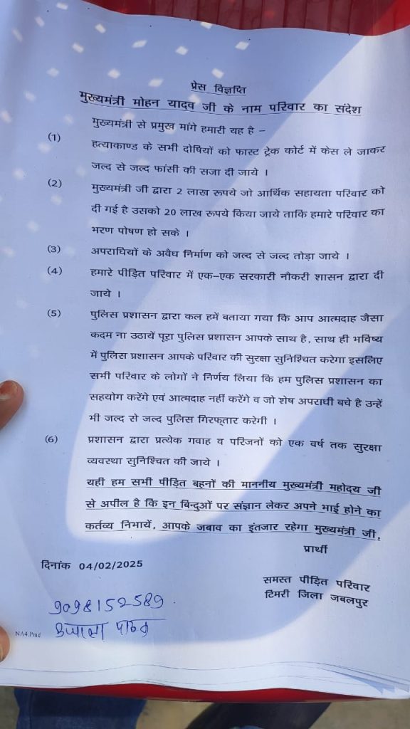 संदेश पत्र में सीएम द्वारा घोषित 2 लाख की सहायता राशि को बढ़ाकर 20 लाख करने की मांग की है। इसके अलावा मृतकों के परिवारों में एक-एक सदस्य को सरकारी नौकरी दिए जाने, गवाहों और पीड़ित परिवारों को एक साल तक पुलिस सुरक्षा देने की और फास्ट्रेक कोर्ट में मामला चलाकर दोषियों को फांसी देने की गुहार लगाई है। पुलिस प्रशासन की समझाइश के बाद पीड़ित परिवारों ने आत्मदाह का इरादा त्याग दिया है। पीड़ित परिवार ने सामूहिक आत्महत्या की चेतावनी दी थी। जानकारी उजाला पाठक, पीड़ित परिवार की सदस्य ने दी है।