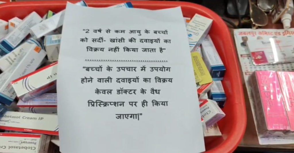 जबलपुर के दवा बाजारों में पर्चा चस्पा कर बिना डॉक्टरी पर्चे के दवा न देने की अपील की जा रही है। इन पर्चों में 2 साल से कम बच्चे को बिना डॉक्टरी पर्चे के कफ सिरप और दवा न देने की अपील की गई है। इसके साथ ही राज्य सरकार और डीजीसीए के एडवाइजरी भी चस्पा की जा रही है।