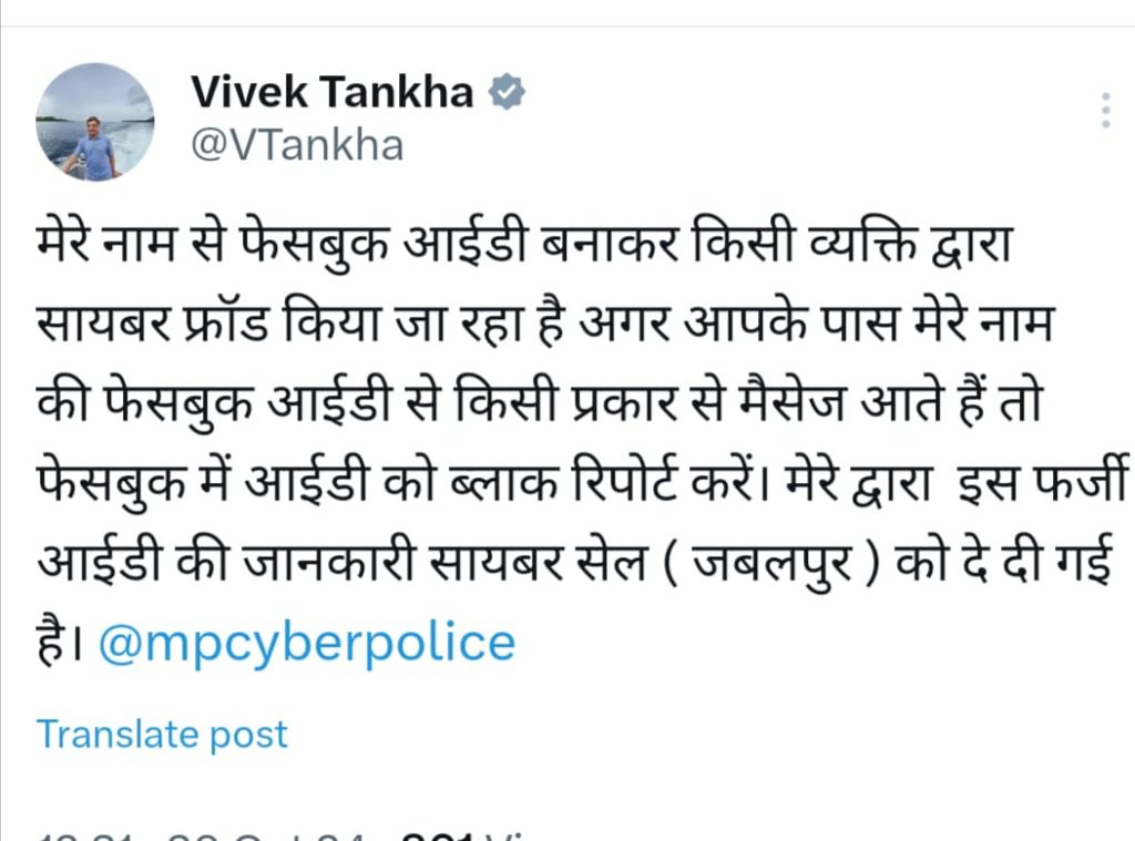 राज्यसभा सांसद विवेक तन्खा ने फर्जी अकाउंट बनाने की जानकारी दी है। उन्होंने अपने सोशल मीडिया अकाउंट एक्स पर पोस्ट कर लिखा- मेरे नाम से फेसबुक आईडी बनाकर किसी व्यक्ति द्वारा सायबर फ्रॉड किया जा रहा है अगर आपके पास मेरे नाम की फेसबुक आईडी से किसी प्रकार से मैसेज आते हैं तो फेसबुक में आईडी को ब्लाक रिपोर्ट करें। मेरे द्वारा इस फर्जी आईडी की जानकारी सायबर सेल (जबलपुर) को दे दी गई है।