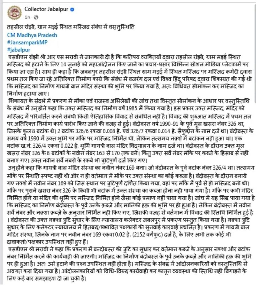 ये भी पढ़ें: जबलपुर में मड़ई मस्जिद को लेकर बवाल: हिंदू संगठनों ने कलेक्टर का निकाला अर्थी जुलूस, हटाने की मांग, मंदिर की जमीन पर अवैध निर्माण का आरोप, 16 जुलाई को बंद का ऐलान