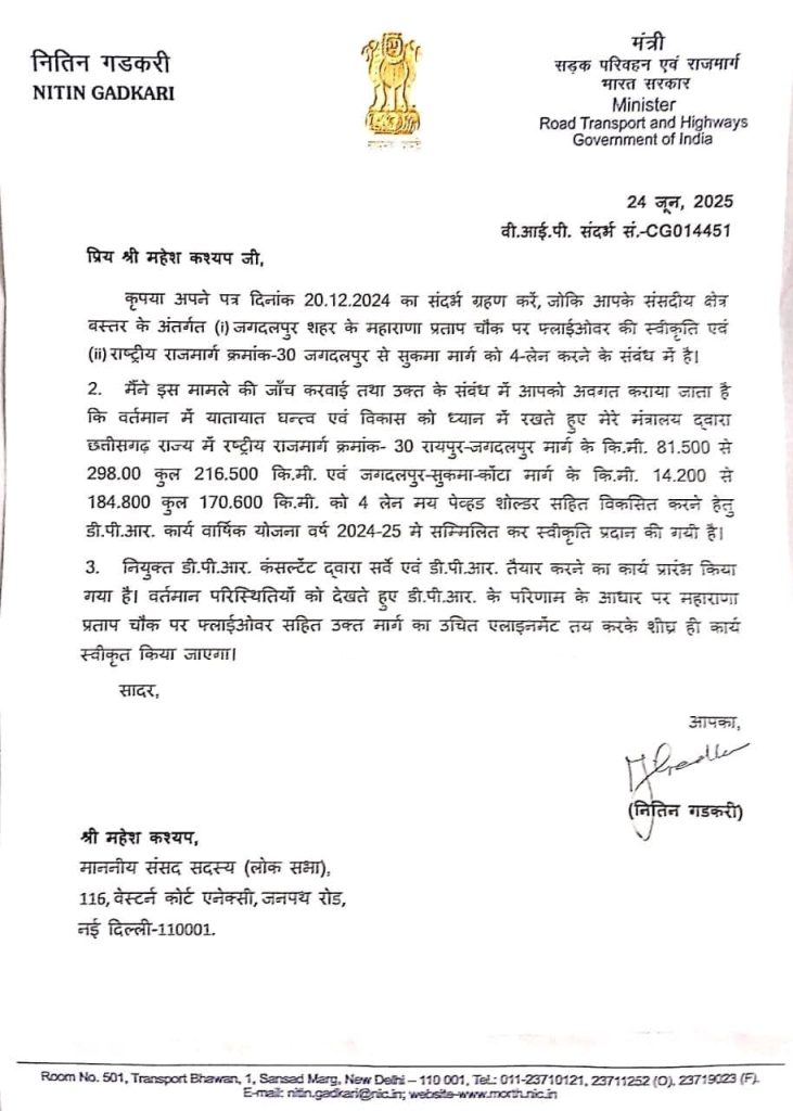 आशुतोष तिवारी, जगदलपुर। बस्तर क्षेत्र की वर्षों पुरानी मांग को आखिरकार केंद्र सरकार ने हरी झंडी दे दी है। जगदलपुर शहर के सबसे व्यस्ततम चौराहे महाराणा प्रताप चौक पर अब फ्लाईओवर का निर्माण किया जाएगा। केंद्रीय सड़क परिवहन एवं राजमार्ग मंत्री नितिन गडकरी ने इस कार्य के लिए स्वीकृति दे दी है। उन्होंने यह जानकारी बस्तर सांसद महेश कश्यप को पत्र लिखकर दी।