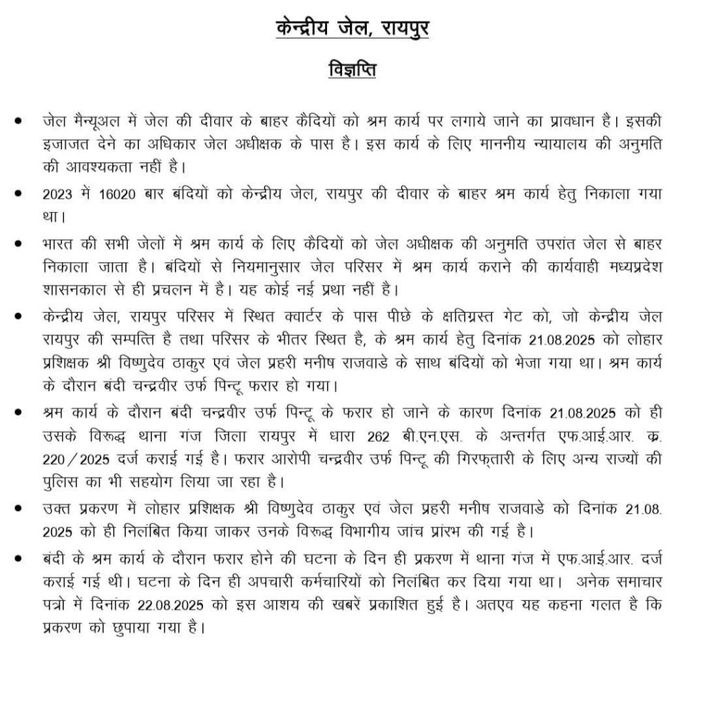 शिवम मिश्रा, रायपुर। रायपुर केंद्रीय जेल से उम्रकैद की सजा काट रहा बंदी चंद्रवीर उर्फ पिंटू फरार होने की घटना ने प्रदेश की राजनीति में हलचल मचा दी है। पूर्व सीएम भूपेश बघेल के आरोपों के बाद अब जेल प्रशासन ने अपना पक्ष स्पष्ट करते हुए कहा है कि कैदियों को जेल परिसर से बाहर श्रम कार्य पर भेजना जेल मैनुअल का हिस्सा है और इसके लिए अदालत की अनुमति जरूरी नहीं है।