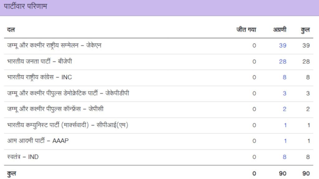 Jammu-Kashmir Assembly Election : जम्मू-कश्मीर विधानसभा के लिए जारी मतगणना के चुनाव आयोग के ताजा आंकड़ों के हिसाब से 39 सीटों पर बढ़त हासिल कर नेशनल कांफ्रेंस पहले स्थान पर काबिज है, वहीं भाजपा 28 सीटों पर बढ़त के साथ दूसरी बड़ी पार्टी बनकर उभरी है. चुनाव में नेशनल कांफ्रेंस की सहयोगी कांग्रेस को महज 8 सीटों पर बढ़त बनाए हुए है. अन्य दल और निर्दलीय 15 सीटों पर बढ़त बनाए हुए हैं.