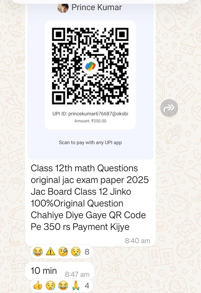 बताया जा रहा है कि दो दिन पहले जैक बोर्ड एग्जामिनेशन क्वेश्चन पेपर 2025 नाम से एक व्हाट्सएप ग्रुप क्रिएट किया गया था। इसमें एक स्कैनर का इस्तेमाल करते हुए छात्रों से प्रश्न पत्र देने के एवज में 350 रुपये की मांग की जा रही थी। इस ग्रुप में जुड़ने के लिए इस ग्रुप का लिंक दूसरे सोशल मीडिया साइट्स पर वायरल किया गया और देखते ही देखे उसे लिंक के जरिए क्वेश्चन पेपर वाले ग्रुप से 1000 से ज्यादा लोग जुड़ गए।