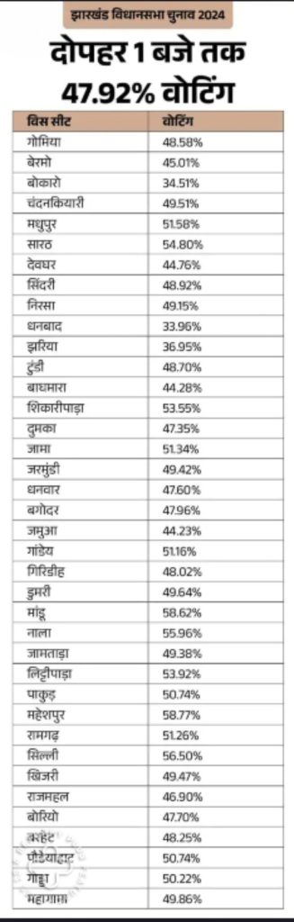 Jharkhand Elections 2024 LIVE: झारखंड विधानसभा चुनाव (Jharkhand vidhan sabha chunav) के आखिरी और सेकेंड फेज में आज 12 जिलों की 38 सीटों पर मतदान सुबह 7 बजे से जारी है। चुनाव आयोग (election Commission) ने दोपहर बजे के वोटिंग आंकड़े जारी कर दिए हैं। राज्य की सभी 38 सीटों पर दोपहर 1 बजे तक औसतन 47.92% मतदान हो चुका है। सबसे अधिक वोटिंग पाकुड़ जिले में 53.83 फीसदी हुई है। वहीं, सबसे कम वोटिंग धनबाद में 33.96 फीसदी हुई है। विधानसभावार देखें तो महेशपुर में सबसे ज्यादा 58.77 फीसदी मतदान हुआ है।