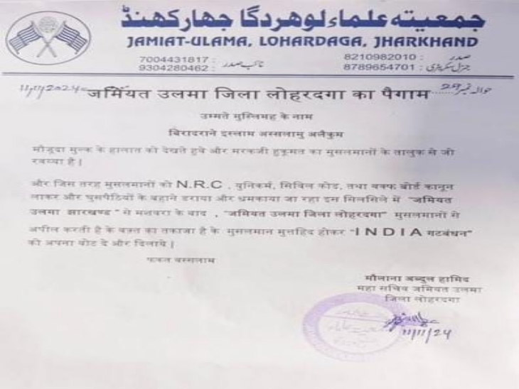 आदेश में आगे कहा गया कि “ऐसे में इस सिलसिले में ‘जमीयत उलेमा झारखंड’ से राय मशवरा करने के बाद ‘जमीयत उलेमा जिला लोहरदगा’ मुसलमानों से अपील करती है कि वक्त है कि मुसलमान एक होकर इंडिया गठबंधन को अपना वोट दे और दिलाएं.”
