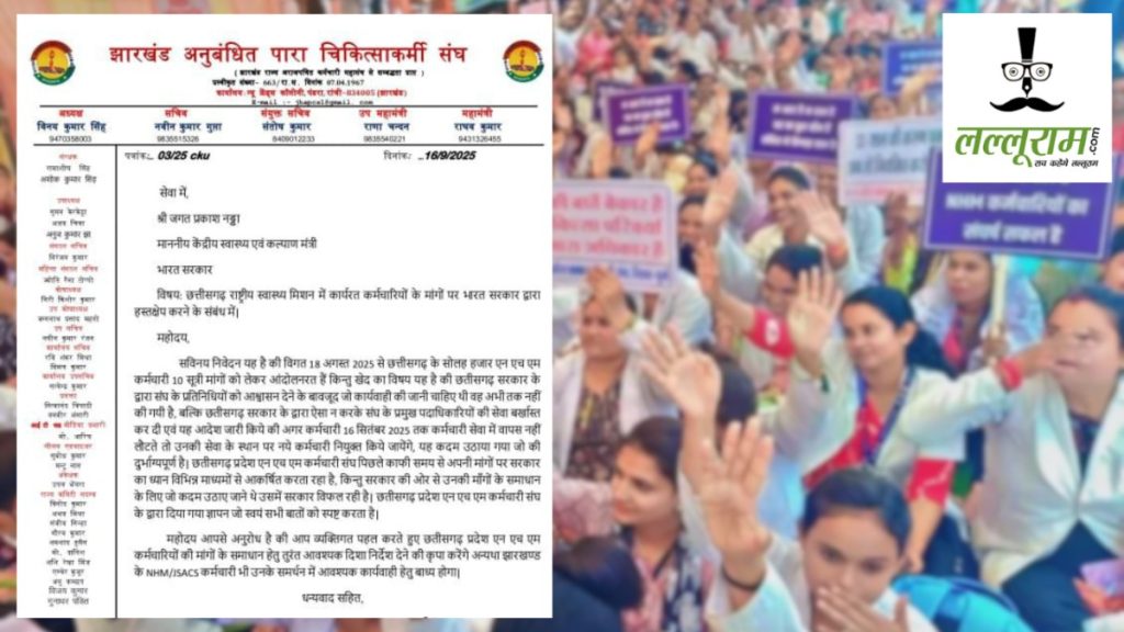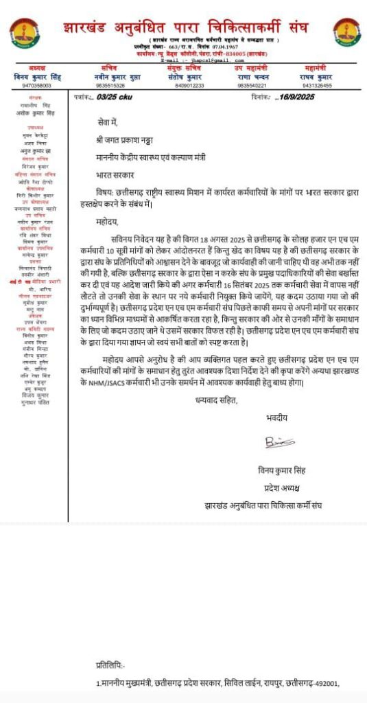 शिकायत में बताया गया कि 18 अगस्त 2025 से छत्तीसगढ़ के 16 हजार एनएचएम कर्मचारी अपनी 10 सूत्री मांगों को लेकर हड़ताल पर हैं। कर्मचारियों का कहना है कि सरकार ने संघ के प्रतिनिधियों को आश्वासन तो दिया, लेकिन अब तक कोई ठोस कार्रवाई नहीं की गई। इसके विपरीत सरकार ने संघ के प्रमुख पदाधिकारियों को सेवा से बर्खास्त कर दिया और आदेश जारी किया कि अगर कर्मचारी 16 सितंबर तक ड्यूटी पर वापस नहीं लौटते तो उनकी जगह नए कर्मचारियों की नियुक्ति कर दी जाएगी. इसे कर्मचारी संघ ने दुर्भाग्यपूर्ण कदम बताया है.