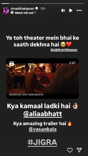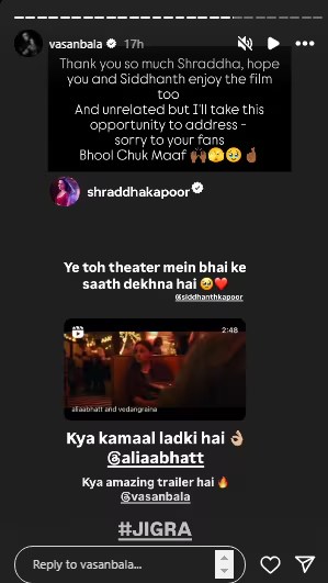 एक्ट्रेस आलिया भट्ट (Alia Bhatt) और वेदांग रैना (Vedang Raina) की अपकमिंग फिल्म ‘जिगरा’ (Jigra) का ट्रेलर रिलीज हो चुका है. वहीं, ‘स्त्री 2’ (Stree 2) एक्ट्रेस श्रद्धा कपूर (Shraddha Kapoor) ने अपनी इंस्टाग्राम स्टोरी पर फिल्म की तारीफ किया है. जिसके बाद ‘जिगरा’ (Jigra) के डायरेक्टर वासन बाला (Vasan Bala) ने श्रद्धा की स्टोरी को अपने स्टोरी पर शेयर करते हुए उनसे माफी मांगी है.