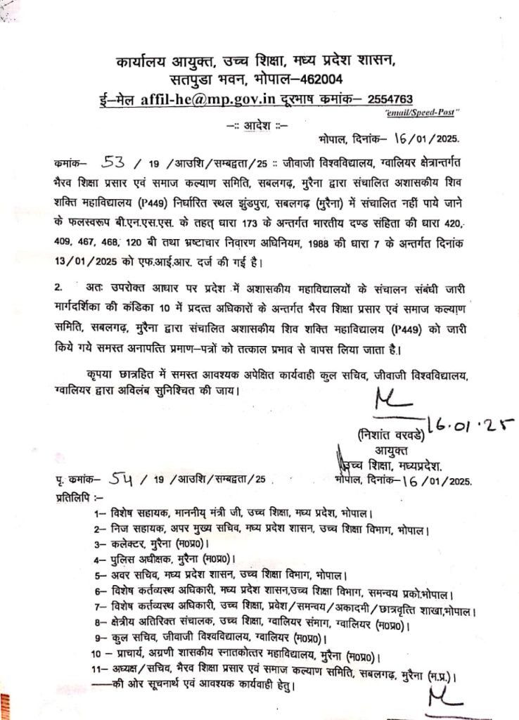 शब्बीर अहमद, भोपाल। जीवाजी यूनिवर्सिटी फर्जीवाड़ा से जुड़ी बड़ी खबर सामने आई है। EOW में एफआईआर दर्ज होने के बाद उच्च शिक्षा विभाग ने बड़ा एक्शन लिया है। उच्च शिक्षा विभाग ने मुरैना जिले के शिवशक्ति महाविद्यालय की मान्यता रद्द कर दी है।