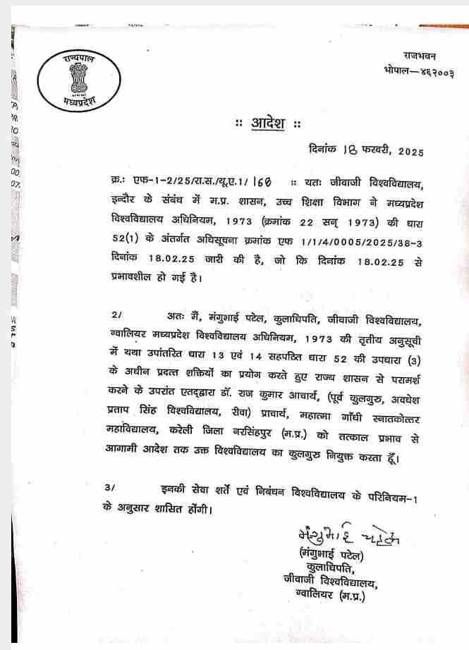 कर्ण मिश्रा, ग्वालियर। जीवाजी विश्वविद्यालय के कुलगुरु डॉ. अविनाश तिवारी और EC मेम्बर को बर्खास्त कर दिया गया है। साथ ही यूनिवर्सिटी में धारा 52 लागू कर दी गई है। EOW में कुलगुरु समेत 17 प्रोफेसर्स पर केस दर्ज होने के बाद राज्यपाल मंगुभाई पटेल ने कार्रवाई की है। इस मामले में आदेश भी जारी कर दिया गया है।