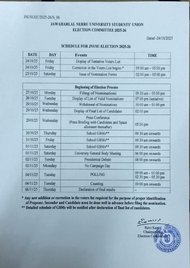2 नवंबर को उम्मीदवारों के बीच पारंपरिक “प्रेसीडेंशियल डिबेट” आयोजित की जाएगी, जो जेएनयू चुनाव का सबसे अहम चरण माना जाता है। 3 नवंबर को ‘नो-कैंपेन डे’ रहेगा, जबकि अगले दिन यानी 4 नवंबर को मतदान सुबह 9 बजे से शाम 5:30 बजे तक दो चरणों में होगा। परिणाम 6 नवंबर को घोषित किए जाएंगे।