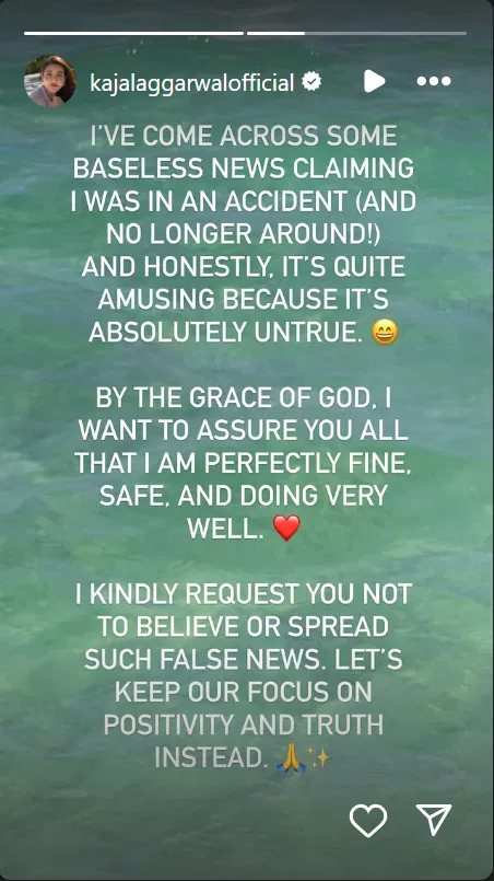 बता दें कि काजल अग्रवाल (Kajal Aggarwal) ने अपने एक्स (पूर्व में ट्विटर) पर एक पोस्ट और इंस्टाग्राम पर स्टोरी शेयर किया है. इस स्टोरी में अभिनेत्री ने अपनी सेहत के बारे में जानकारी देते हुए अपने फैंस को अफवाहों से दूर रहने के लिए कहा है. उन्होंने लिखा, ‘मुझे कुछ बेबुनियाद खबरें मिली हैं, जिनमें दावा किया गया है कि मेरा एक्सीडेंट हुआ था (और अब मैं दुनिया में नहीं हूं.) और सच कहूं तो यह काफी मजेदार है क्योंकि यह बिल्कुल झूठ है.’
