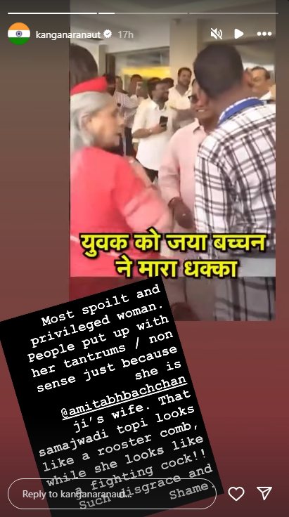 बता दें कि इस वीडियो सामने आने के बाद कई लोगों ने जया बच्चन (Jaya Bachchan) के व्यवहार की आलोचना कर रहे हैं. इसी कड़ी में कंगना रनौत (Kangana Ranaut) ने अपनी इंस्टाग्राम स्टोरी पर पोस्ट शेयर करते हुए लिखा, “ये सबसे बिगड़ी हुई और प्रिविलेज वाली महिला हैं. लोग उनके सभी नखरे सिर्फ इसलिए बर्दाश्त करते हैं क्योंकि वो अमिताभ बच्चन जी की पत्नी हैं.”