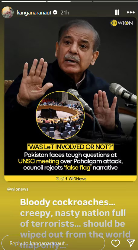 कंगना रनौत ने पाकिस्तान की हालिया कायराना हरकत के बाद अपने इंस्टाग्राम पर WION की एक न्यूज़ रिपोर्ट को साझा किया है. इस रिपोर्ट में 22 अप्रैल को पहलगाम में हुए आतंकी हमले में पाकिस्तान की संलिप्तता के लिए यूएन सुरक्षा परिषद में पाकिस्तान से सवाल उठाए गए थे. कंगना ने इस रिपोर्ट के साथ पाकिस्तान के खिलाफ तीखी प्रतिक्रिया व्यक्त करते हुए उसे एक खौफनाक और आतंकवाद से भरे देश के रूप में वर्णित किया, और यह भी कहा कि इसे दुनिया के नक्शे से मिटा देना चाहिए.
