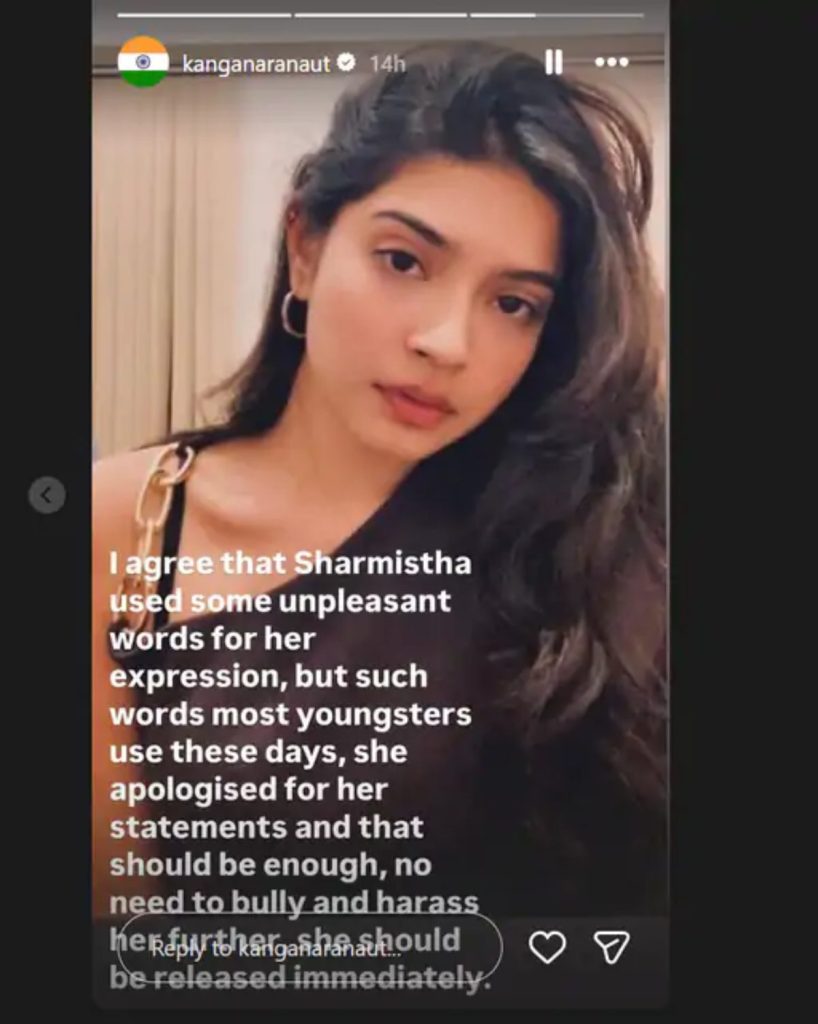 कंगना रनोट ने शर्मिष्ठा की गिरफ्तारी पर अपना रिएक्शन देते हुए इंस्टाग्राम स्टोरी पर लिखा- “मैं मानती हूं कि शर्मिष्ठा ने अपने वीडियो में कुछ अनुचित शब्दों को इस्तेमाल किया, लेकिन ऐसे शब्द आजकल ज्यादातर युवा इस्तेमाल करते हैं। उसने अपने बयान के लिए माफी मांगी है और इतना पर्याप्त होना चाहिए। उसे अब और अधिक धमकाने या परेशान करने की जरूरत नहीं है। उसे तुरंत रिहा किया जाना चाहिए।