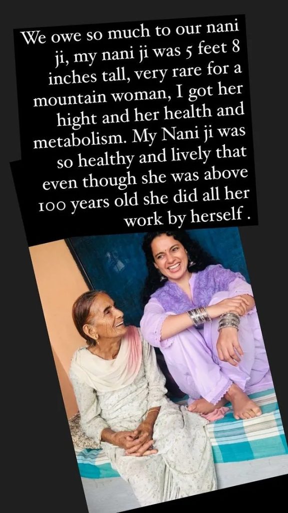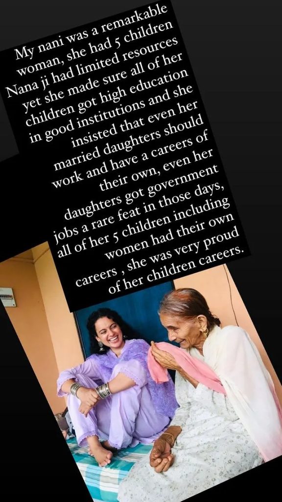 स्टोरी में कंगना रनौत (Kangana Ranaut) ने दूसरी फोटो में एक लंबा चौड़ा पोस्ट शेयर किया है, जिसमें उन्होंने लिखा, ‘मेरी नानी बहुत ही बेहतरीन औरत थीं, उनके 5 बच्चे थे, नाना जी की कमाई ज्यादा नहीं थी, लेकिन फिर भी उन्होंने अपने सभी बच्चों को अच्छे से पढ़ाया. उनके बच्चों को सरकारी नौकरी भी मिली,जो इस समय में मिलना काफी मुश्किल हुआ करती थी. उनके सभी बच्चे नौकरी करते हैं और उन्हें अपने सभी बच्चों पर बहुत गर्व था.’ Read More – Bhool Bhulaiyaa 3 का नया पोस्टर आया सामने, दीवाली पर खुलेगा तंत्र और मंत्र के साथ बंधा दरवाजा …