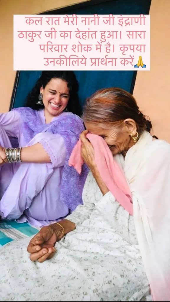 बॉलीवुड एक्ट्रेस और सांसद कंगना रनौत (Kangana Ranaut) के फैंस के लिए एक बूरी खबर सामने आ रही है. कुछ समय पहले ही एक्ट्रेस ने सोशल मीडिया पर अपनी नानी इंद्राणी ठाकुर (Indrani Thakur) के निधन की खबर शेयर किया है. जिसके बाद से उनके घर पर पर मातम पसर गया है. कंगना रनौत (Kangana Ranaut) ने खुद इसकी जानकारी सोशल मीडिया पर दी है.