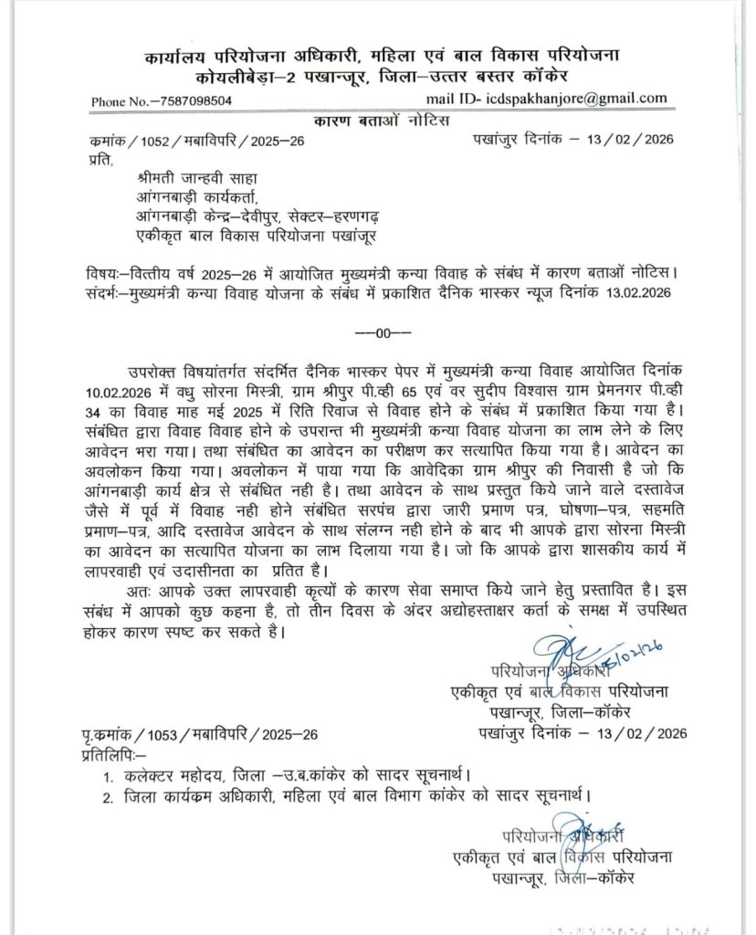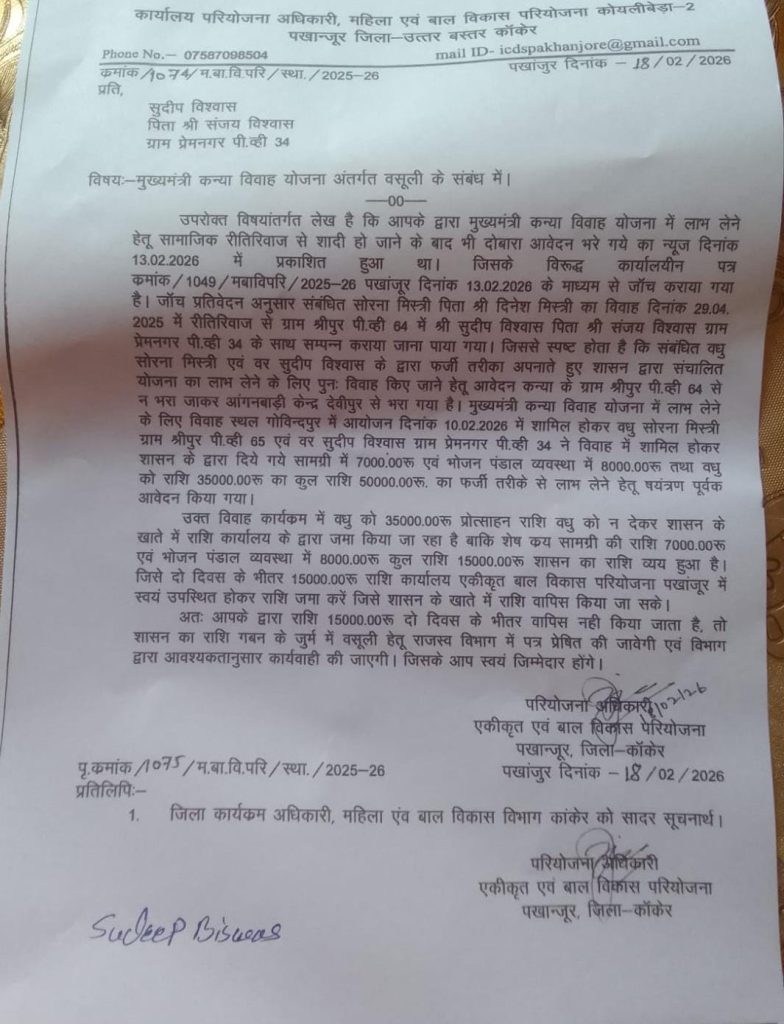 मामले में महिला एवं बाल विकास विभाग ने नोटिस जारी कर राशि वसूली के निर्देश दिए हैं. महिला एवं बाल विकास परियोजना, कोयलीबेड़ा-2 पखांजूर द्वारा जारी पत्र के अनुसार, जांच में पाया गया कि संबंधित जोड़े ने योजना का लाभ लेने के लिए दोबारा विवाह किया. 35 हजार रुपए की प्रोत्साहन राशि में से 15 हजार रुपए की राशि तत्काल वापस जमा करने के निर्देश दिए गए हैं. दो दिन में राशि जमा नहीं करने पर संबंधित हितग्राही के खिलाफ गबन की धाराओं में एफआईआर दर्ज कर कानूनी कार्रवाई की जाएगी. वहीं संबंधित आंगनबाड़ी कार्यकर्ता को भी कारण बताओ नोटिस जारी किया गया है.