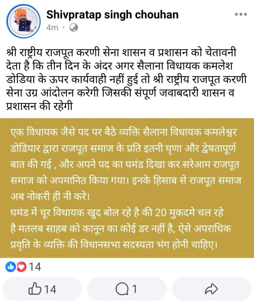 सुशील खरे, रतलाम। सैलाना विधायक कमलेश्वर डोडियार और डॉ. के विवाद में करणी सेना की एंट्री हो गई है। राष्ट्रीय राजपूत करणी सेना के प्रदेश अध्यक्ष शिव प्रताप सिंह चौहान ने सोशल मीडिया पर एक पत्र जारी कर ये चेतावनी दी है कि सैलाना विधायक पद का दुरुपयोग कर रहे हैं। साथ ही अस्पताल में उस दिन हुए विवाद का एक सीसीटीवी फुटेज भी जारी किया, जिसमें विधायक ठाकुर समाज पर तंज कस रहे हैं। साथ ही डॉक्टर को धमका रहे हैं। जिसमें उन्होंने कहा कि मेरे ऊपर 20 मुकदमे हैं। और एक कर देना, तीन दिन में उचित कार्रवाई नहीं हुई तो उग्र आंदोलन किया जाएगा।