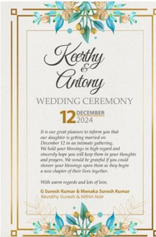 वहीं, इससे पहले कीर्ति सुरेश (Keerthy Suresh) का शादी के इनविटेशन कार्ड का फोटो भी वायरल हुआ था. वेडिंग इनविटेशन में लिखा था, “आपको यह बताते हुए हमें बहुत खुशी हो रही है कि हमारी बेटी 12 दिसंबर को एक निजी समारोह में विवाह कर रही है. हम आपके आशीर्वाद का बहुत सम्मान करते हैं और ईमानदारी से आशा करते हैं कि आप उन्हें अपने विचारों और प्रार्थनाओं में रखेंगे. हम आभारी होंगे यदि आप उन्हें अपना आशीर्वाद दे सकें क्योंकि वे अपने जीवन का एक नया अध्याय शुरू कर रहे हैं. हार्दिक शुभकामनाओं और ढेर सारे प्यार के साथ, जी सुरेश कुमार और मेनका सुरेश कुमार रेवती सुरेश और नितिन नायर. Read More – Bhool Bhulaiyaa 3 का नया पोस्टर आया सामने, दीवाली पर खुलेगा तंत्र और मंत्र के साथ बंधा दरवाजा …